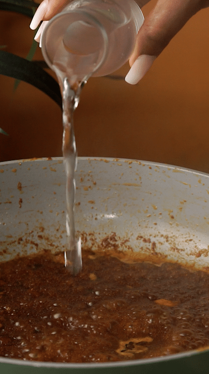 Water. Helps loosen the sauce and allows it to reduce into a glaze as it cooks.