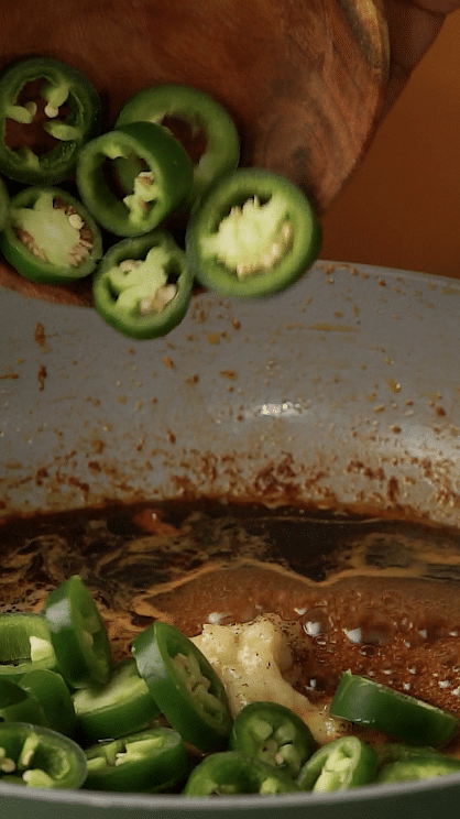 In the same skillet, add soy sauce, water, honey, garlic paste, black pepper, and jalapeño slices. Stir gently and bring to a simmer.
