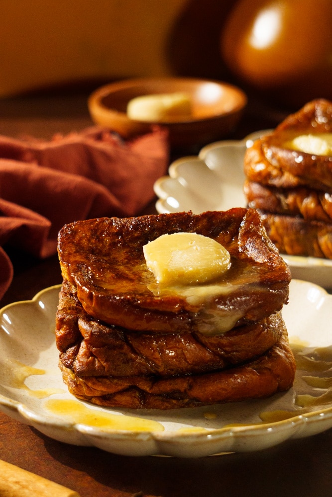 - Stack the slices on plates and generously drizzle with the Trader Joes Maple Butter and a touch of agave. Add optional toppings like powdered sugar, toasted pecans or whipped cream if you like. Serve immediately while still warm.